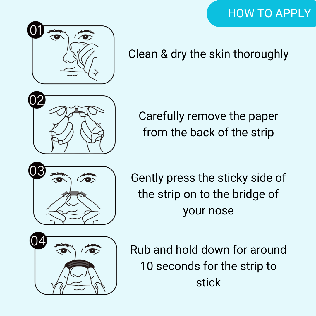 They are super-easy to use; simply clean your skin with warm water and thoroughly dry (this removes any oils), remove the paper from the back of the strip and apply across the bridge of your nose and just touching the nostril, then gently press into place whilst the adhesive settles. To remove just wash with warm water, ideally in the shower, and gently peel away from the nose.